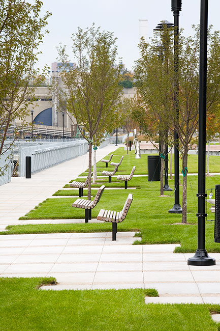 這個公園的設(shè)計是基于海灣的概念建造的,作為該區(qū)域作用力的聚集區(qū)。這個形式是城市和水作用力的結(jié)果。公園的元素是根據(jù)規(guī)模進(jìn)行分散和分類,就好像波浪留下的痕跡一樣。元素包括花崗巖石凳(從防水壁中回收來的)、分離的草坪塊以及三角形花壇。這個路面在形狀上使用了波浪的圖案。碼頭遵循了土地構(gòu)成的形式,而不是歷史上的碼頭結(jié)構(gòu)。碼頭提供了各種各樣與水相關(guān)的活動,包括釣魚、游覽船、生態(tài)意識以及一般的休閑娛樂。植物材料創(chuàng)造出兩種生態(tài):有混合的落葉樹的林地、低矮的下層植被和多年生地表覆蓋物,以及海灣,海灣以300英尺長五彩的海濱區(qū)多年生的植被花壇為特色,種植在公園的一端,還有傾斜草坪,用于舉辦多個活動。