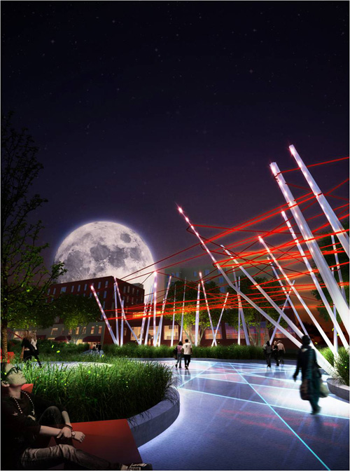 另外,在公園的北側(cè)設(shè)置竹林,使用紅色的竹棚鞏固圍合場(chǎng)地的竹子。竹林前設(shè)有公共休息平臺(tái)擺放著不同的運(yùn)動(dòng)健身設(shè)施和臨時(shí)家具。公園的西南角筑起了紅色的繩子戲棚,成為場(chǎng)地表演舞臺(tái)的同時(shí)賦予慶喜公園一個(gè)新的現(xiàn)代門戶,與現(xiàn)狀傳統(tǒng)門戶互相呼應(yīng)。地面上冰裂紋的鋪裝使用了不同大小切割的混凝土塊和燈帶為切分來表達(dá),豐富場(chǎng)地在白天和晚上的趣味性。