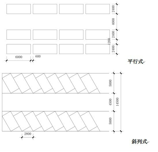 4.停車場的停車方式,根據(jù)地形條件以占地面積小、疏散方便、保證安全為原則,主要停車方式有平行式、斜列式、垂直式三種。其中間最小距離以小型車為例,停車方式見下圖 平行式 斜列式 垂直式
