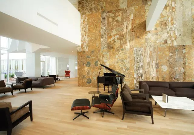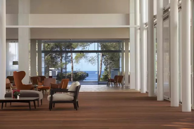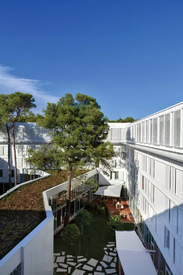 原有的Bellevue酒店建于1967年,由克羅地亞建筑師茲得拉夫科設(shè)計建成。如今的改造由Rusan建筑事務(wù)所完成,改造后的建筑更貼切地反映了現(xiàn)代對于獨特性和舒適性的要求,同時也采用了一些令人驚嘆的設(shè)計元素,比如中庭的設(shè)計:改造后的中庭內(nèi)墻面采用了深色柚木的材質(zhì),與明亮輕快的空間和原有的白色表層形成了對比。為了讓建筑與庭院有更多的融合,建筑師設(shè)計了一個可敞開的玻璃走廊,引導(dǎo)客人從前方的入口走入內(nèi)部的種有大樹的庭院。