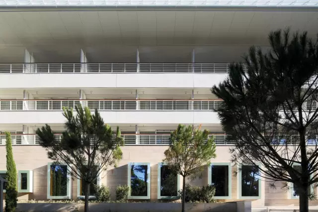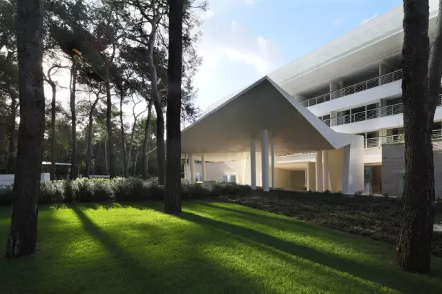 現(xiàn)代主義的強硬的幾何形體的置入,破壞了Bregovac原有的線性形態(tài)設(shè)計,但同時也形成了與環(huán)境更親密的關(guān)系。中庭的明暗對比主題,通過橫向的百葉窗延伸到了外立面上,這使得建筑的平衡感和連續(xù)性得到了保持。游泳池,健身和按摩設(shè)施放置在大堂的下面。為了創(chuàng)造一個有趣的氛圍,內(nèi)部墻面裝飾上了一層彩色的馬賽克磚。