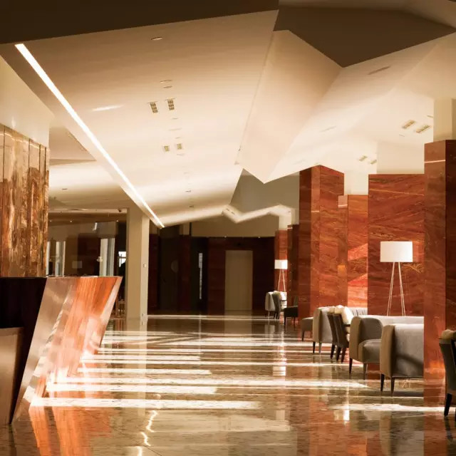 ↗前臺的印度蘋果木與大廳中的水磨石地板以及波斯石柱完美結(jié)合