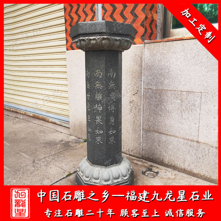 在寺院大殿右側(cè)通常會設(shè)個小小的石雕出食臺(施食臺),體恤饑困的眾生。一面刻寺院名稱,另外七面刻七如來名稱。石雕出食臺有各種不同形制、材質(zhì),造型上沒有固定的法制,多以幢型居多,常見的是石材,也有木刻。高度至少一百多公分以上,常見的有1.2米石雕出食臺。有圓形長柱、四面柱、八角型柱等不同形狀。