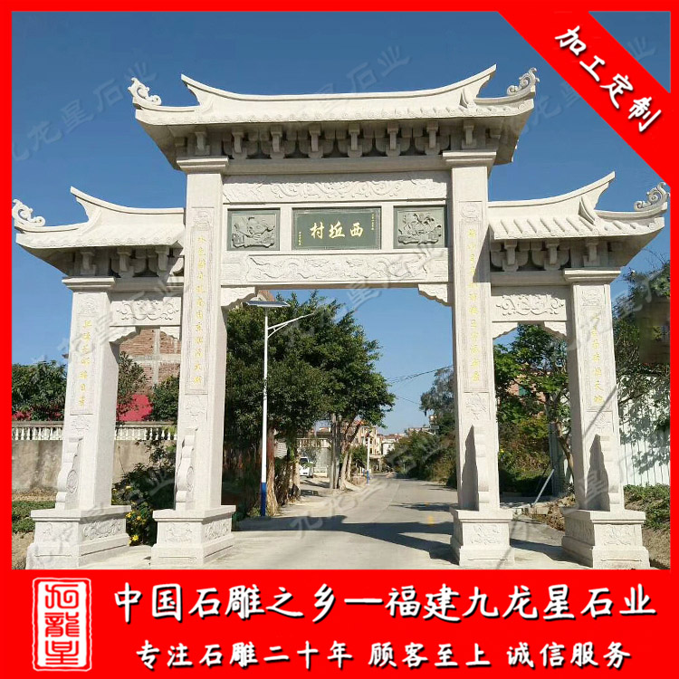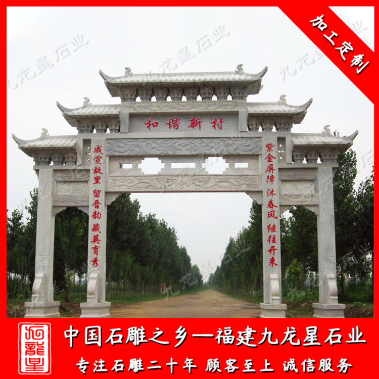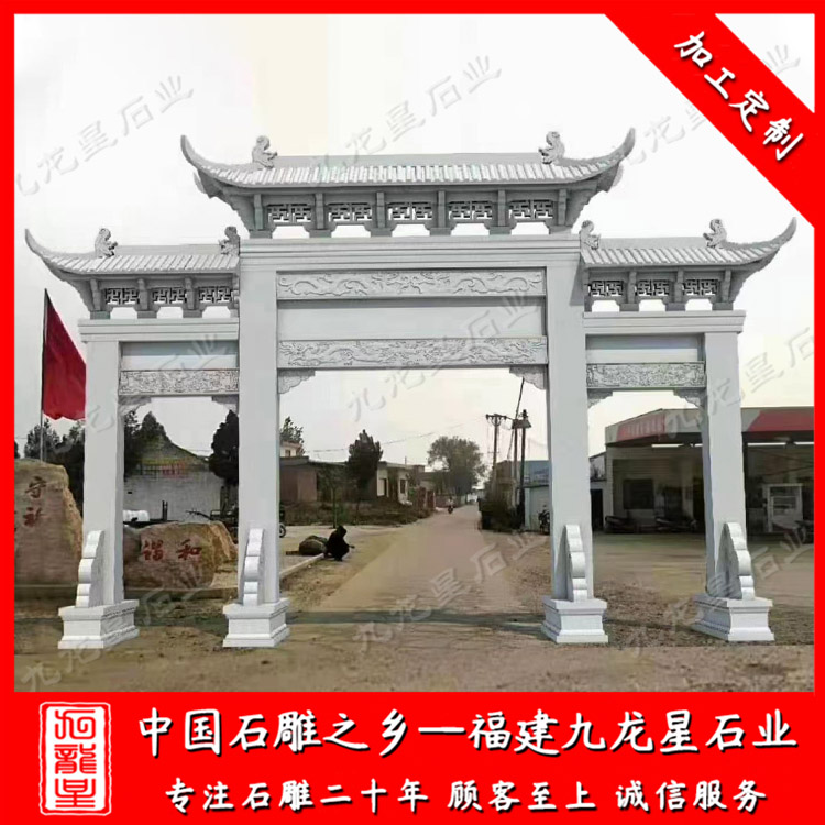 九龍星是石業(yè)是石雕牌坊、石頭牌坊廠家,常年批發(fā)村門石頭牌坊、農(nóng)村三門石牌坊等,款式多樣、可定制,工期快,有需可聯(lián)系我們。