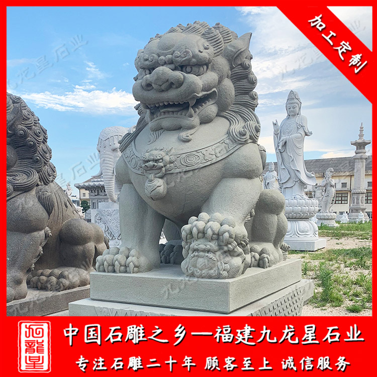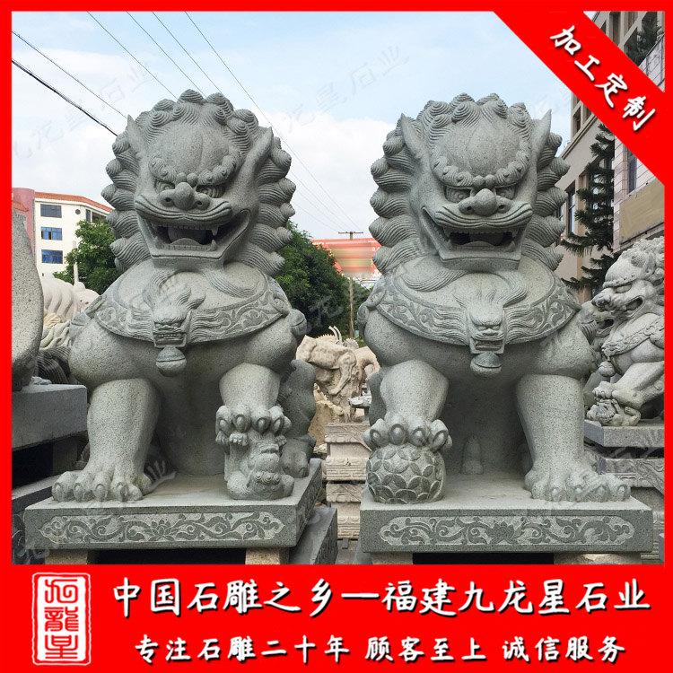 青石獅子,青色的巖石雕刻的石獅子。青石又可分為四川青、羅源青等,無論是哪種青石表面都呈現(xiàn)青綠色,顏色復古樸素?;莅彩硞儠捎檬止さ窨糖嗍{子,這樣的青石獅子線條更具流動感、更為形象、生動。