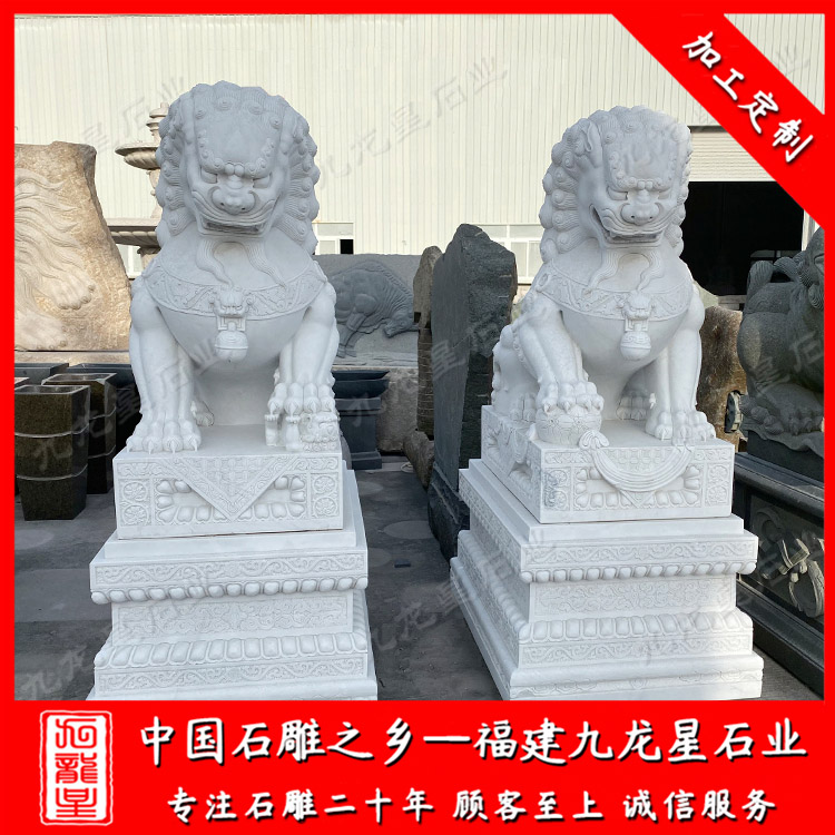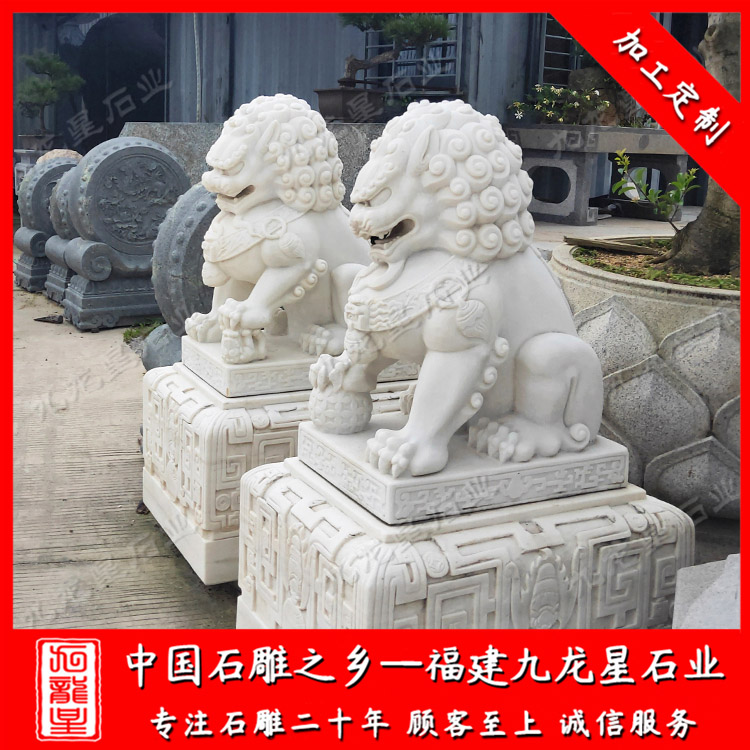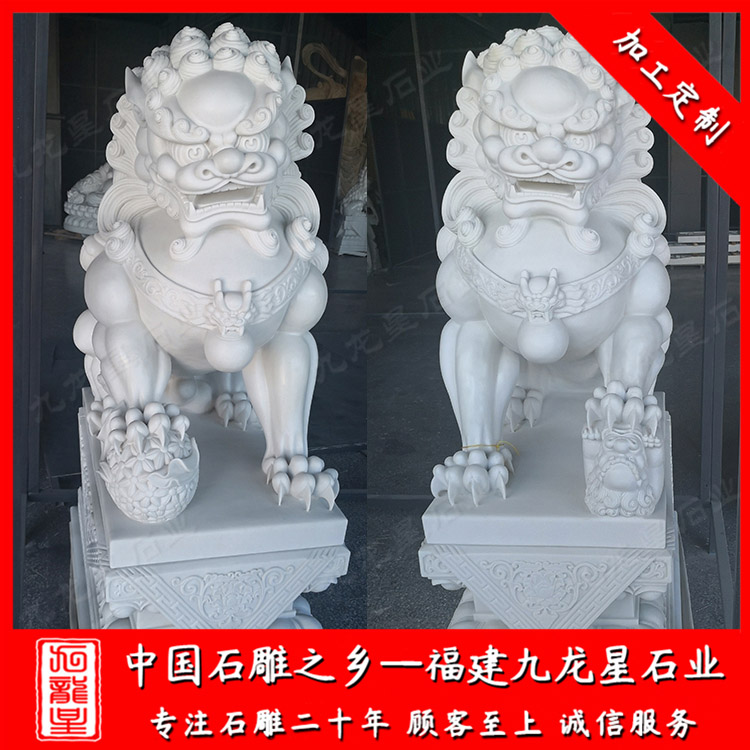 因為漢白玉表面看上去潔白,采用漢白玉雕刻的獅子看上去簡潔大氣、華麗壯觀。漢白玉獅子安裝在銀行門口、別墅門口、酒店門口等地方。