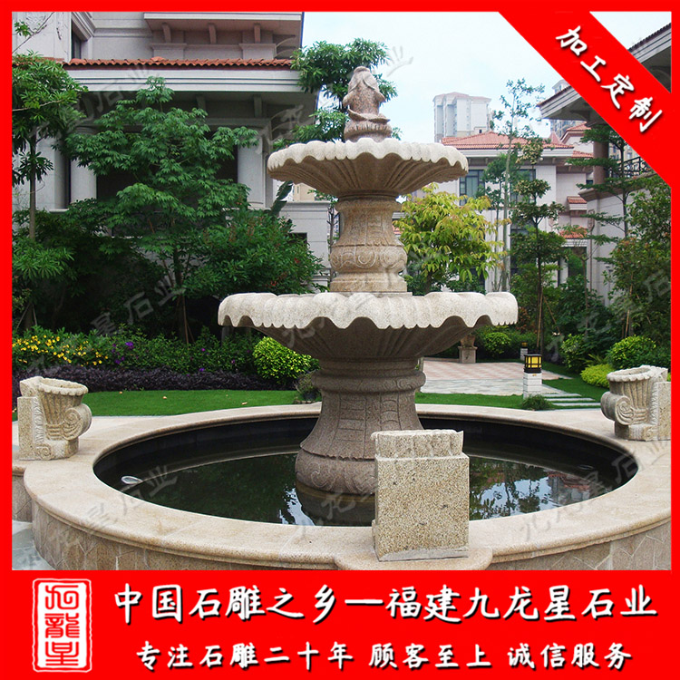 黃銹石石雕水缽噴泉圖片款式也是十分的多。安裝大盤的個(gè)數(shù)分,有單層黃銹石石雕噴泉、雙層黃銹石噴泉、三層銹石水缽噴泉。安裝款式的風(fēng)格分有歐式水缽雕塑和中式噴泉水缽這兩大類。