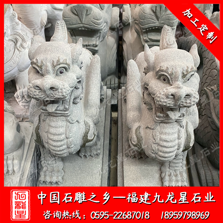 石雕貔貅乃龍的第九個兒子。相傳貔貅是一種兇猛的瑞獸,這種猛獸分有雌和雄,雄為“貔”雌為“貅”。貔貅身無毛、無鱗、無肛門,所以有“只進不出”之說,貔貅頭生獨角和雙角,神態(tài)威武,兇猛異常,喜歡吸食魔怪的精血,并轉化為財富。因此,風水術中便將貔貅做為鎮(zhèn)宅辟邪、納財聚財的靈物廣泛使用。貔貅是以財為食,所有納四方之財的功效。