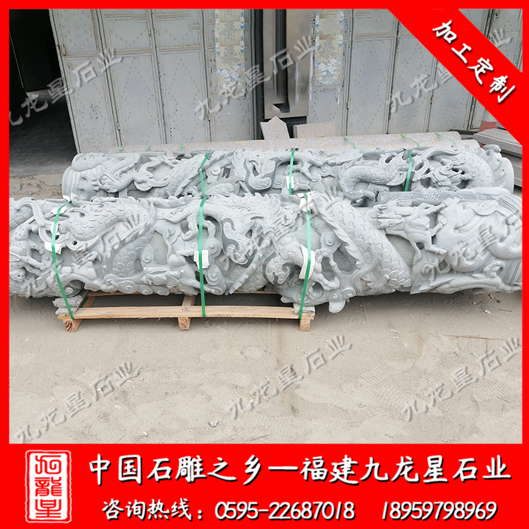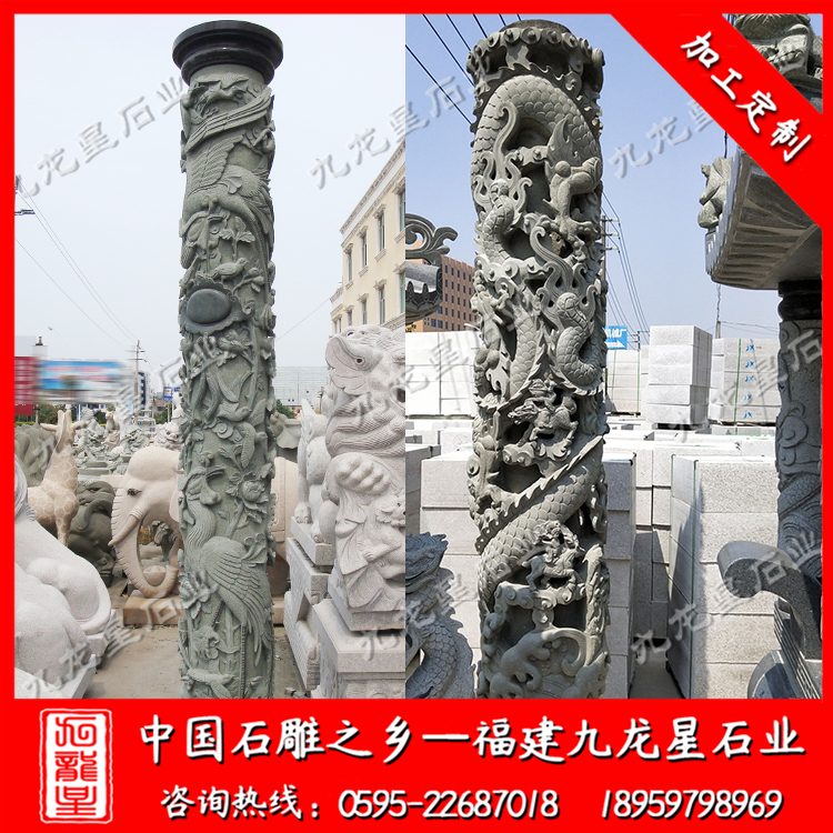石雕龍柱一般采用天青石、漢白玉、草白玉、花崗巖、綠砂巖、紅砂巖、馬頭青等石材,*具代表性的是山東孔廟大成殿里的龍柱,相傳,這深浮雕龍柱因刻的太逼真,堪稱建筑一絶的龍柱,龍柱在孔廟北端的大成殿,立在大成殿前檐,共10根。大成殿前檐的10根柱全為深浮雕,每柱二龍上下對舞,盤繞飛騰,中有龍珠,四雕云霧,柱子上的空閑處還鑲著山石、波濤。十根龍柱,相互對稱,各柱之龍,均具變化,無一雷同,造型之生動,雕刻之剔透,刀法之剛勁,龍姿之神韻,布局之千變?nèi)f化,各種元素和諧統(tǒng)一。石雕龍柱絶對是中國石刻藝術(shù)中罕見的瑰寶。