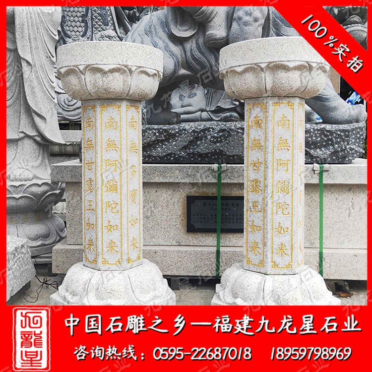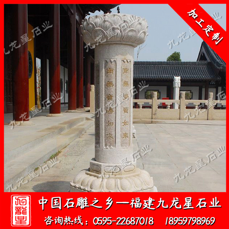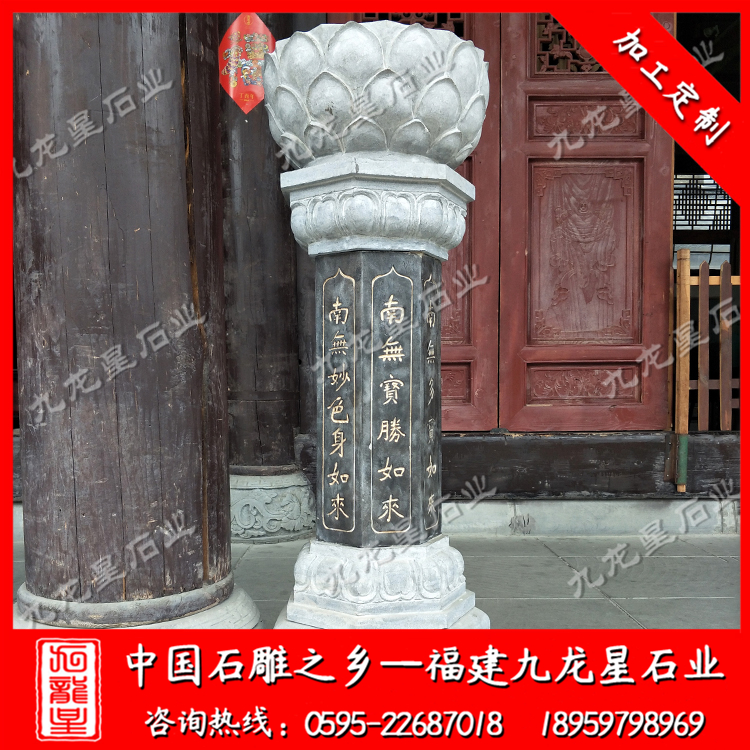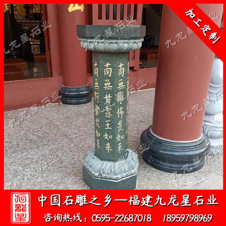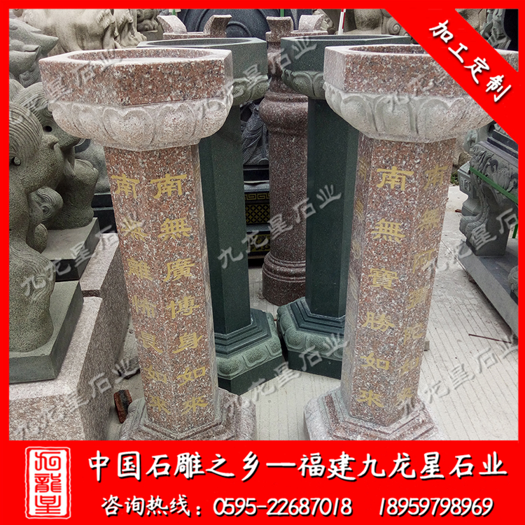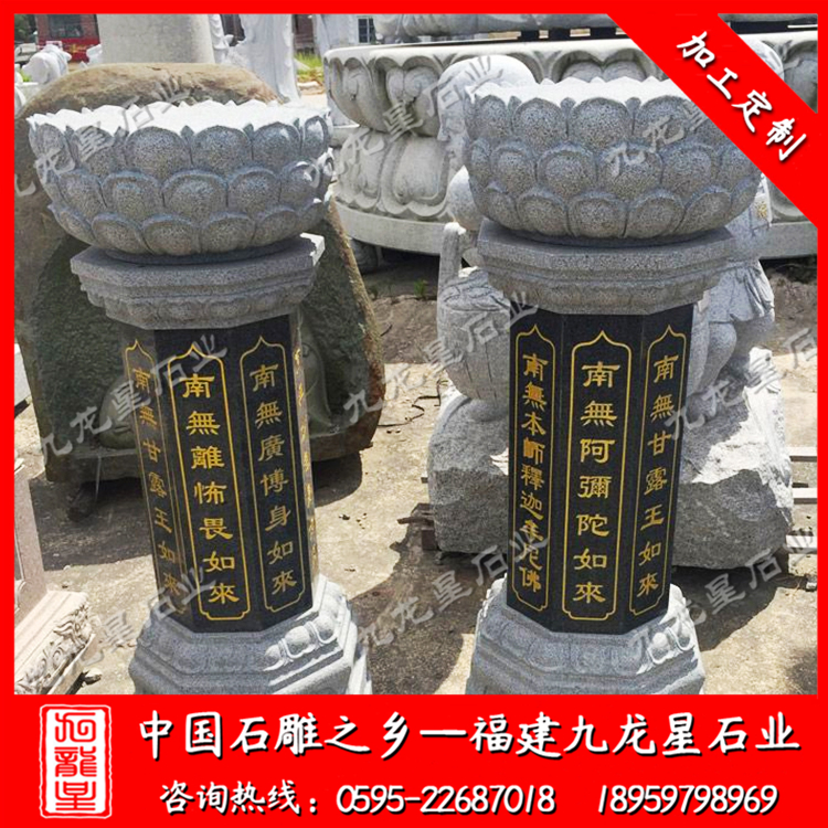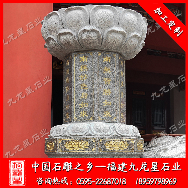 在外觀形式上,不同的寺院一般也會(huì)定做極具個(gè)性化的施食臺(tái)。出食臺(tái)一般為石柱,一般由柱礎(chǔ)、柱身、承露盤三個(gè)部分組成。最常見的施食臺(tái)造型為底座是一塊四邊形的板,上面是一個(gè)單層的俯蓮臺(tái),蓮花瓣會(huì)相對(duì)較大,通常這種蓮花瓣會(huì)做成雙瓣的,更飽滿許多。柱身部分則雕刻七寶如來大名以及本師釋迦牟尼的法名,一般這些雕刻的文字都會(huì)上好金漆。有些寺院需要定制符合寺廟風(fēng)格的,也只是在這種表現(xiàn)方式上進(jìn)行一些調(diào)整而已。當(dāng)然有些調(diào)整比較明顯的也有,那就是把底座調(diào)高,內(nèi)容更加豐富,比例突破常規(guī)造型。也有一些要求比較高的寺院,會(huì)將出食臺(tái)的八面都雕刻上對(duì)應(yīng)的佛像法相,法相下面是對(duì)應(yīng)的佛像名稱。施食臺(tái)的承露盤一般會(huì)由三層蓮花瓣疊加而成,呈仰蓮形態(tài),大小直徑與底座相差無幾。