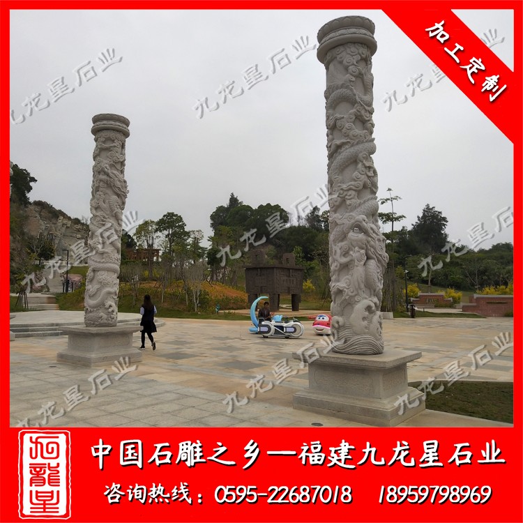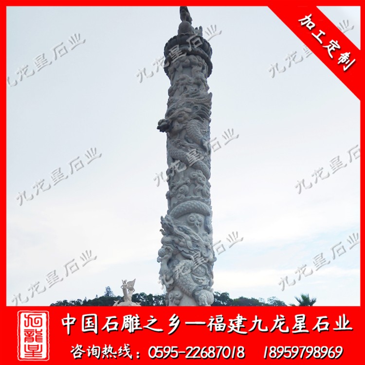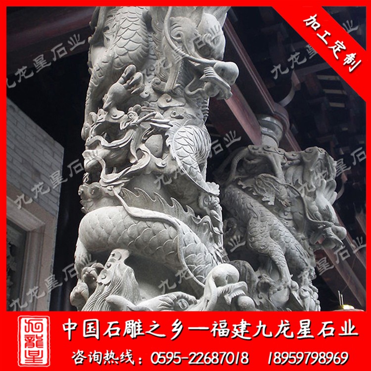 石雕龍柱通常采用青石、漢白玉,芝麻白,銹石,蝦紅等石材加工?,F(xiàn)在的九龍星工匠雕刻工藝也是越來越精湛,所以說古建筑寺廟龍柱的造型也是越來越美觀,造型也越來越合理,這些的改變導致裝飾性也更加的具有競爭力。石雕盤龍柱在中國傳統(tǒng)民間工藝種類繁多,且博大精深,技藝精湛。我國古建筑寺廟龍柱裝飾藝術隨著時代的發(fā)展,其形式和特點也在不斷的發(fā)生演變。