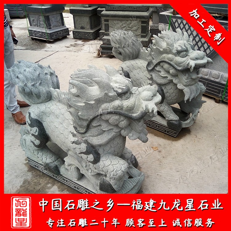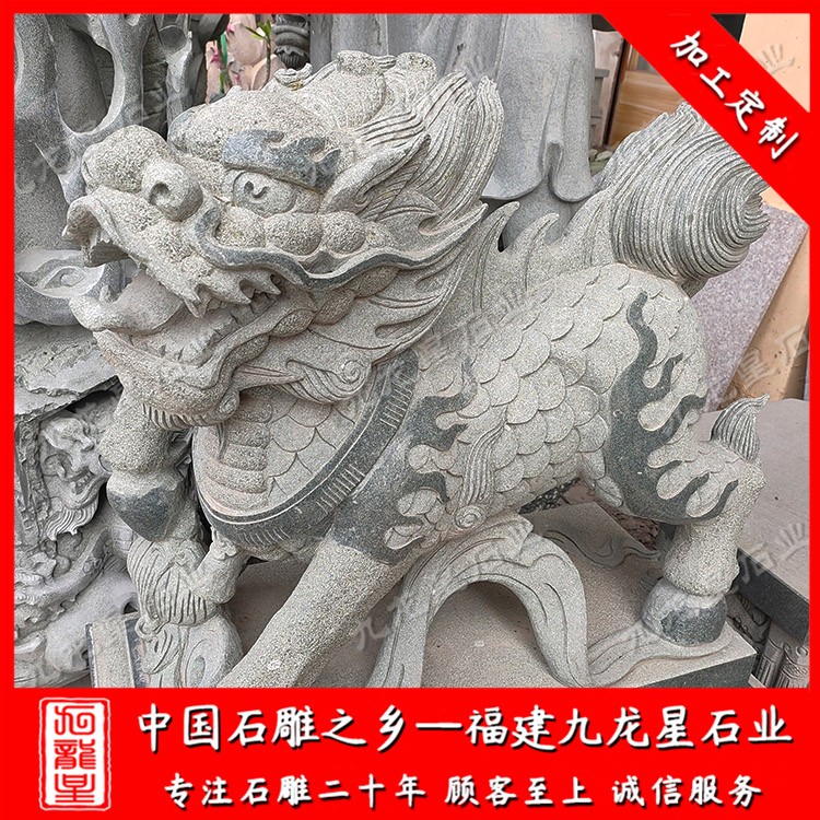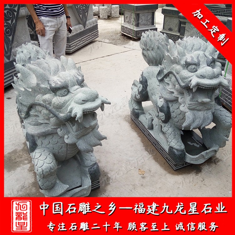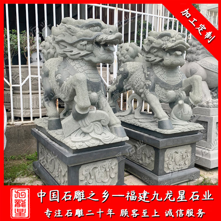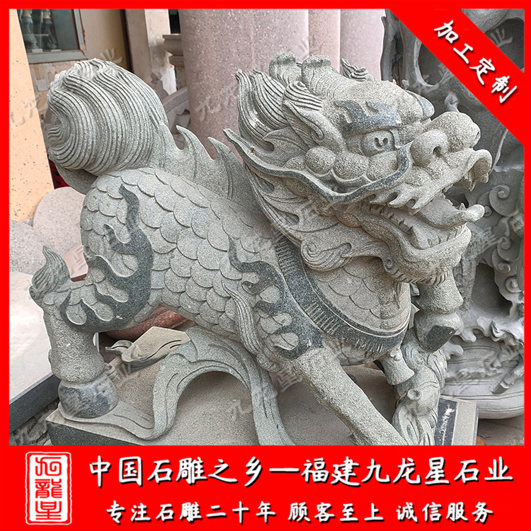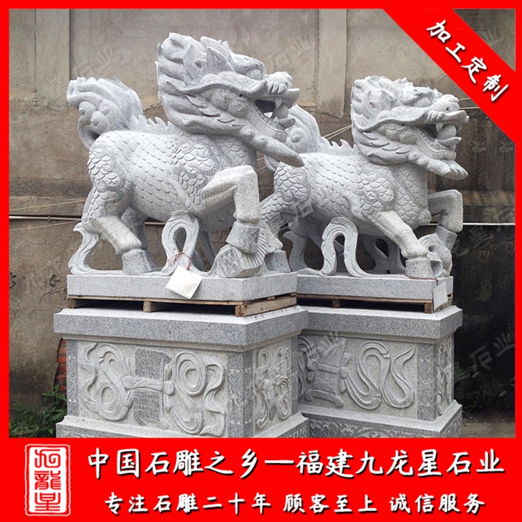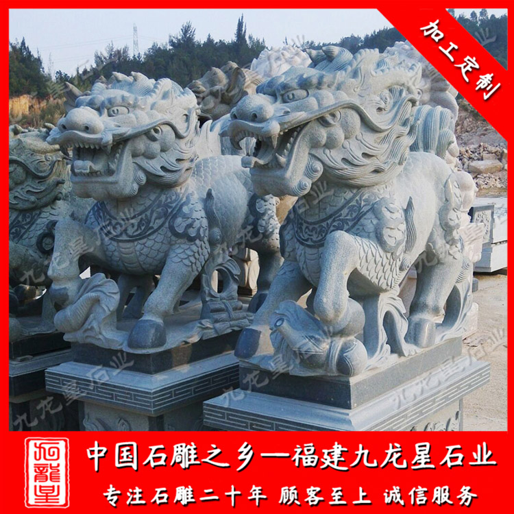 從網(wǎng)絡(luò)上或是從實(shí)際的生活中,我們都不難看到門(mén)口石雕麒麟的圖片,現(xiàn)國(guó)內(nèi)的石麒麟生產(chǎn)廠家也是越來(lái)越多。有浙江石雕麒麟廠家、江西石雕麒麟廠家、福建泉州石雕麒麟廠家。福建九龍星石業(yè)發(fā)展有限公司位于石雕之鄉(xiāng)--福建惠安,是福建泉州石雕麒麟廠家,從事門(mén)口石雕麒麟制作20多年,門(mén)口石雕麒麟圖片款式多樣、門(mén)口石雕麒麟規(guī)格大小可以定zhi,門(mén)口石雕麒麟價(jià)格合理,望廣大新老客戶前來(lái)參觀考察和選購(gòu)。