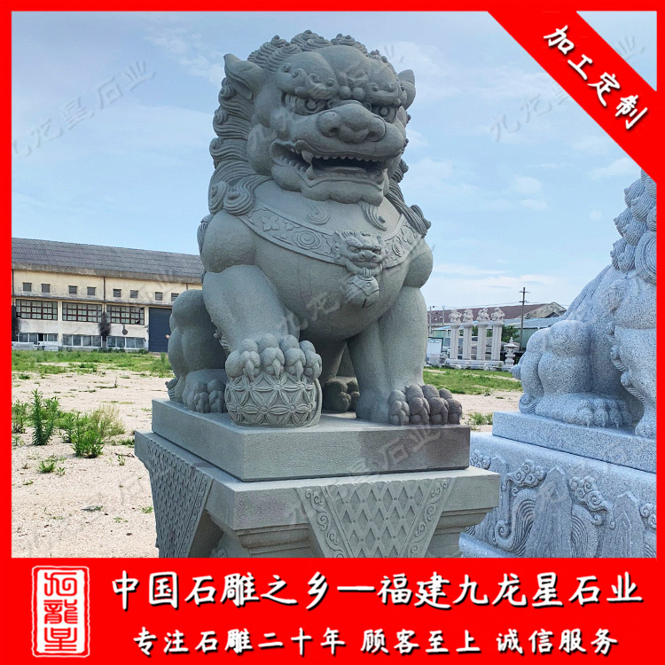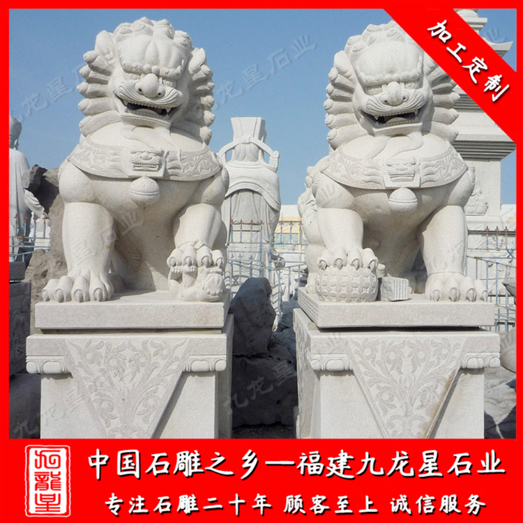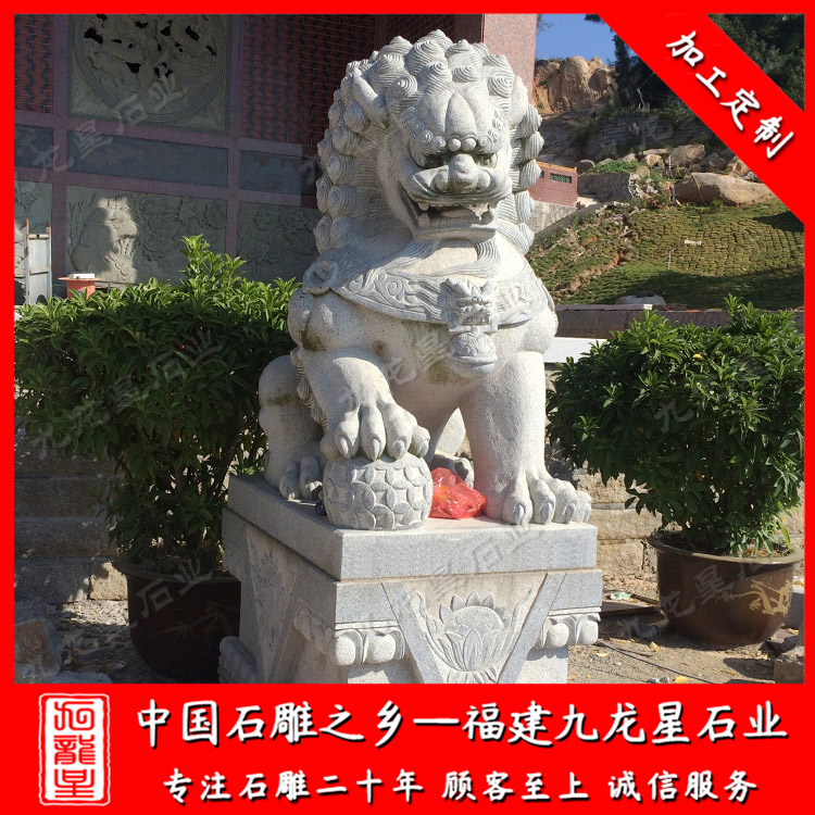 福建九龍星石業(yè)發(fā)展有限公司位于--福建惠安,是寺廟門口石雕獅子廠家,九龍星人相信每塊石頭都獨(dú)馥藝術(shù)氣息,所以善用千年文化雕鑿工藝的研究、傳承、融合和發(fā)揚(yáng),使石雕作品承載藝術(shù)文化、體現(xiàn)更多社會(huì)價(jià)值。九龍星從事寺廟門口石雕獅子加工制作20多年,大型石雕獅子圖片全,有3米石獅子,2.8米石獅子。一對石雕獅子價(jià)格合理。門口石雕獅子的材質(zhì)可以為花崗巖、大理石、漢白玉等等,望廣大新老客戶前來參觀考察和選購。
