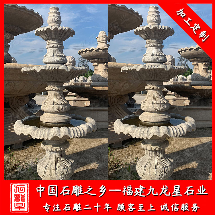 石雕噴泉設(shè)計的造型多種多樣,大致可分為普通噴泉和歐式噴泉兩種:普通噴泉一般盆體多雕刻成為蓮花瓣、荷葉等造型,樸素大方。歐式噴泉的樣式較為多變,一般在盆體的滴水口處都雕刻有獅子頭,頂部還有柱體的四周雕刻有各樣西洋人物,以及其他動物等等。這兩種風(fēng)格造型的噴泉雕塑可以根據(jù)場景的需要來選擇,各有千秋。同時建議水池邊也使用同種石材來安裝,以達到較佳欣賞效果。