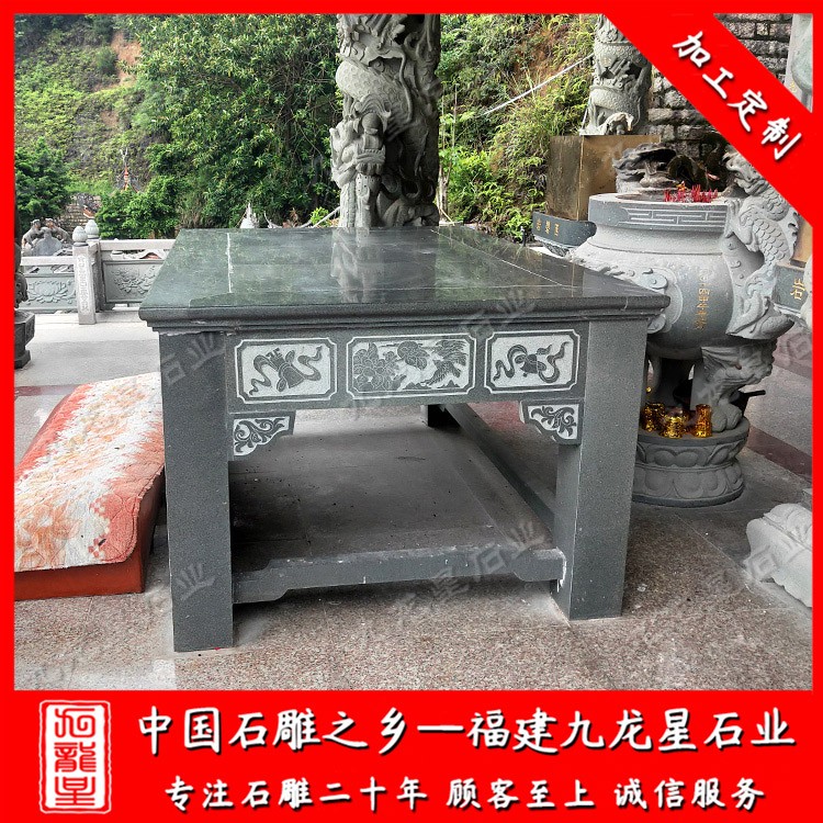 我國(guó)一直以來(lái)就有供奉神仙的習(xí)慣,石雕供桌也是大小型石雕不可缺少的寺廟古建物品,寺廟常見(jiàn)的石雕供桌它放在寺內(nèi)庭堂,它的形狀是長(zhǎng)方形桌子,高度約于方桌差不多高。石雕供桌上面擺放石雕香爐(石雕神臺(tái)),蠟燭,貢品等。石雕供桌的材質(zhì)一般用青石和654質(zhì)地堅(jiān)硬,石雕供桌更是以其質(zhì)樸自然,典雅造型,美觀大方,雕刻精美的深得人心,而且石雕供桌也更經(jīng)久耐用,非人為損壞的情況下,可用上百年。