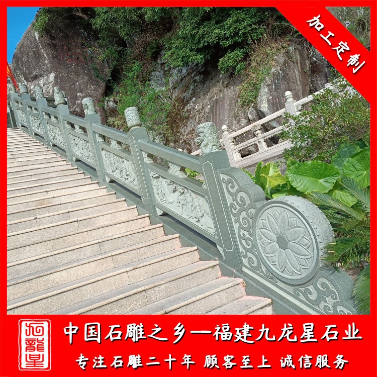 寺廟是一個(gè)神圣嚴(yán)肅的地方,在雕刻石材欄桿護(hù)欄上面的圖案也是十分講究,不能要隨意,需要突出體現(xiàn)寺廟的特點(diǎn)、佛教佛學(xué)文化。若您哪不定主意,可以找有經(jīng)驗(yàn)的石材欄桿廠家進(jìn)行設(shè)計(jì)。九龍星石業(yè)從事石雕行業(yè)二十多年,常年設(shè)計(jì)、加工石材欄桿,歡迎廣大客戶聯(lián)系我們。