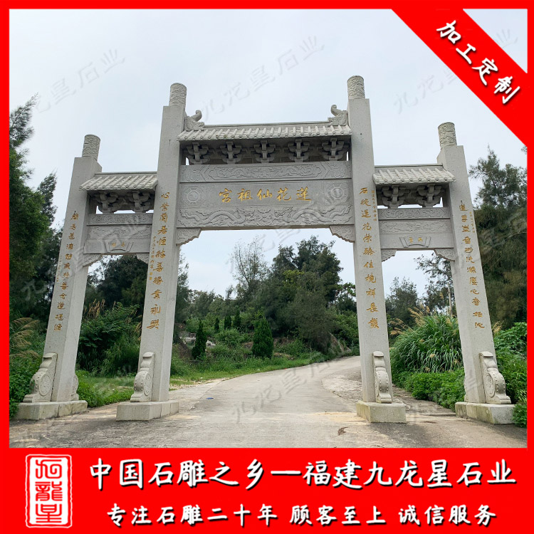 惠安石雕牌坊廠家雕刻的寺廟石雕山門牌坊、三門石牌坊采用花崗巖、青石、大理石等材質(zhì)雕刻加工制作,高度有8米、10米、11米、12米、13米等等,寺廟石雕山門牌坊直徑有10米、11米、12米、13米、15米不等,按照寺廟入口大門的實(shí)際情況而定做。九龍星石業(yè)常年加工批發(fā)石牌坊,款式多樣、工期快,歡迎廣大客戶前來定制。