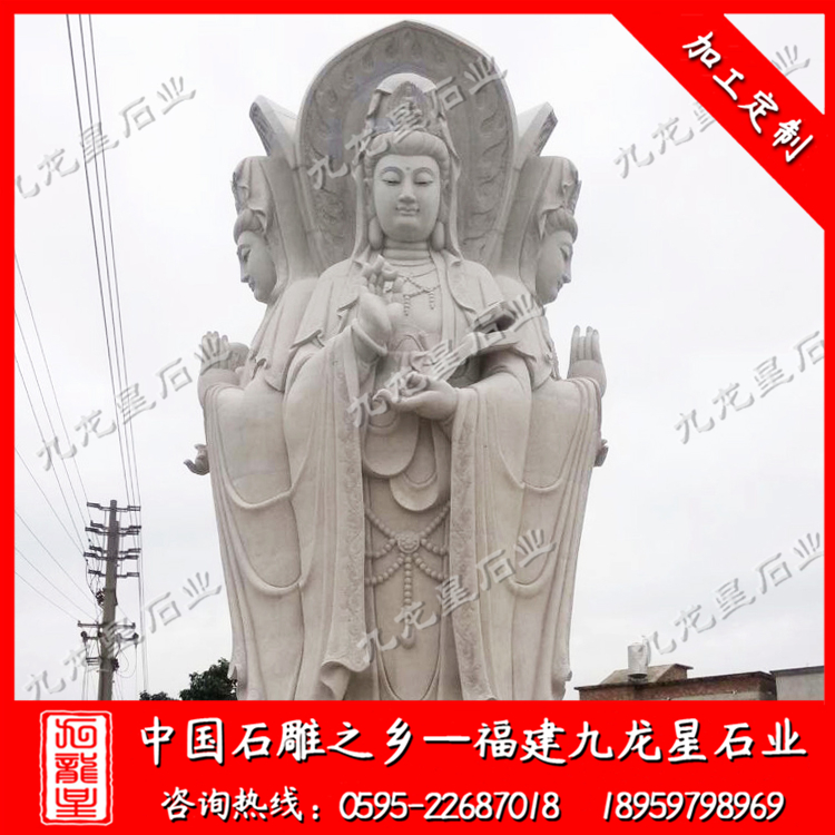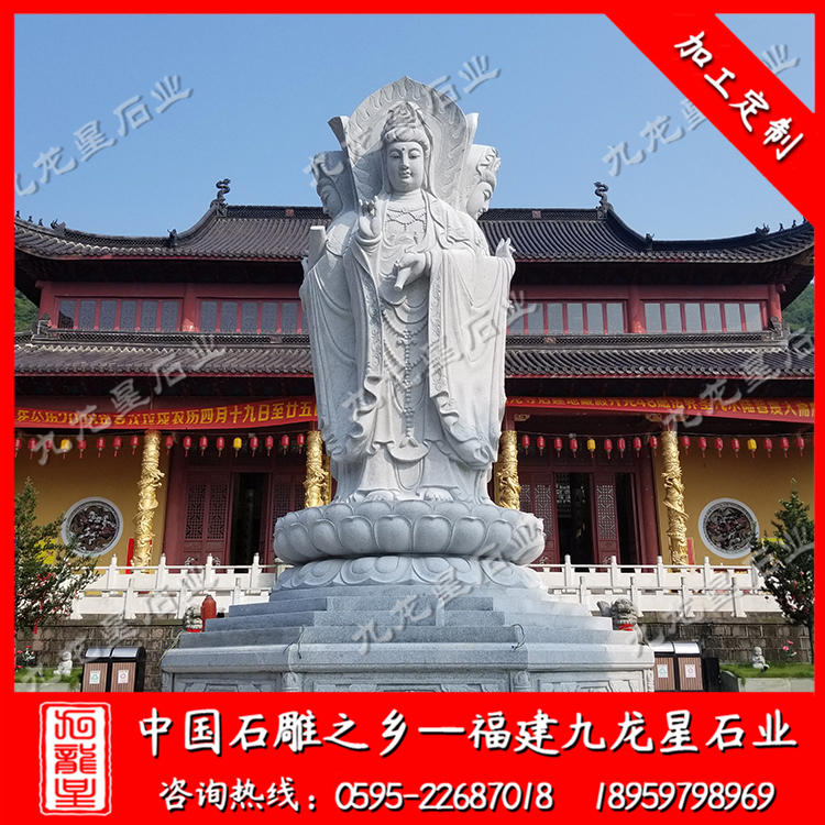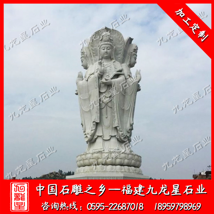 四面觀音石雕像廠家的建造材料有青石、花崗石、大理石、燕子石、漢白玉等。其中,漢白玉建造觀世音富有光澤感和通透感,建造成本稍高;而花崗石和青石建造的觀世音是最為常見,表面有磨砂質(zhì)感,為青白色居多。對于建造規(guī)模大的觀音雕刻來說,選擇花崗石材料價格較為優(yōu)惠。大理石建造的觀世音像,表面平滑,紋理柔和,且大理石名品種類高達三十余種,可變化建造出不同造型的觀世音像。材料的不同影響著石雕觀音像的外觀和造價。