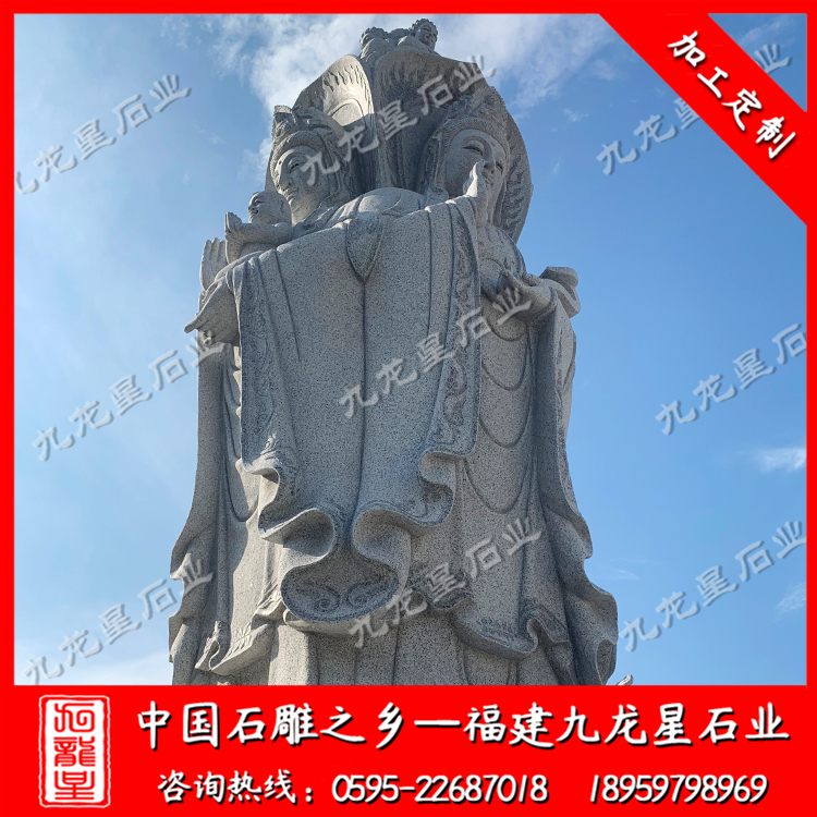 在石雕觀音造型中,石雕四面觀音的形象也是相對比較普遍的。石雕四面觀音分別是凈瓶觀音、送子觀音、阿耨觀音、持經(jīng)觀音合為一體,是經(jīng)過局部分塊鍛造、精密無縫焊接和整體吊裝拼接組合完成的,具有極其復(fù)雜的技術(shù)工藝性和極高的藝術(shù)價值。代表著平安、傳承、吉祥、智慧等美好寓意。