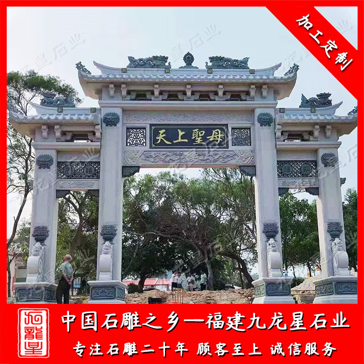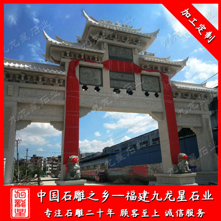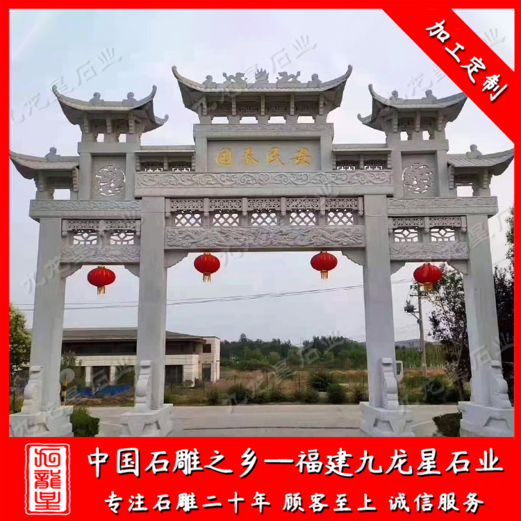 農(nóng)村石牌坊廠家雕刻的村口石牌坊大門多樣、新穎。安裝一座村頭石牌坊、村口石牌坊可以展示美麗鄉(xiāng)村、新農(nóng)村的文化風貌、精神風貌,提高村口的風景。農(nóng)村石牌坊廠家雕刻村口石牌坊大門有三門四柱村口石牌坊大門、單門石牌坊大門、三門五樓村口石牌坊大門、五門村口石牌坊大門等等款式。