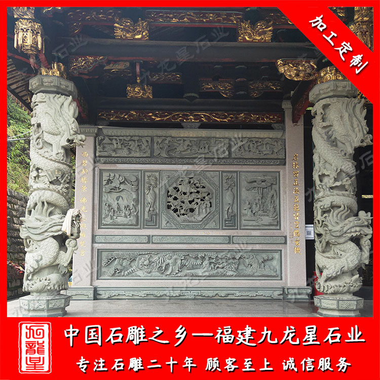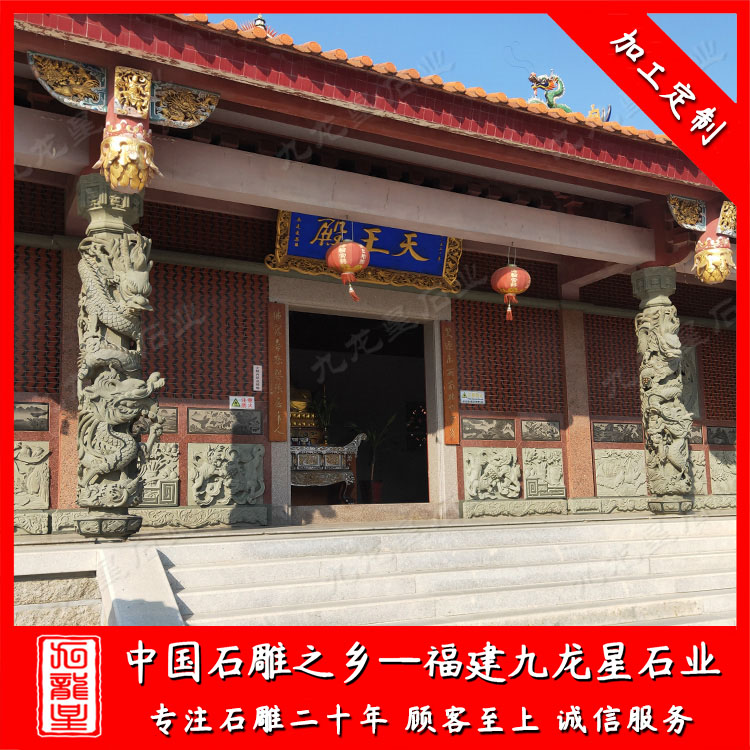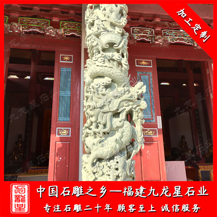 寺廟石雕龍柱或安裝在寺廟大殿內(nèi),或安裝在寺廟門口。雕刻工藝好的寺廟石雕龍柱很是生動(dòng),威嚴(yán)霸氣。